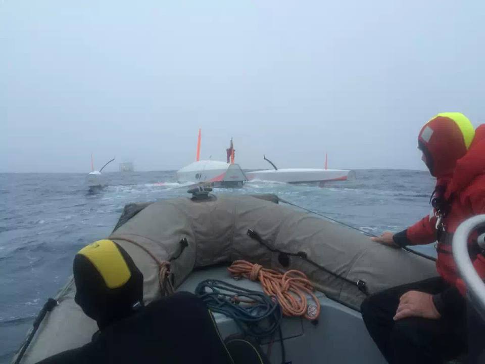 Following their helicopter evacuation at 1700hrs UTC (Tues, Oct 27), it was time to focus on retrieving the boat. That began when the team returned to the boat on Saturday (Oct 31), where they worked through Sunday to prepare for the tow. With the removal of gear and rig, the towing straps were secured near the central hull, and the course was set that evening for Lorient, France.