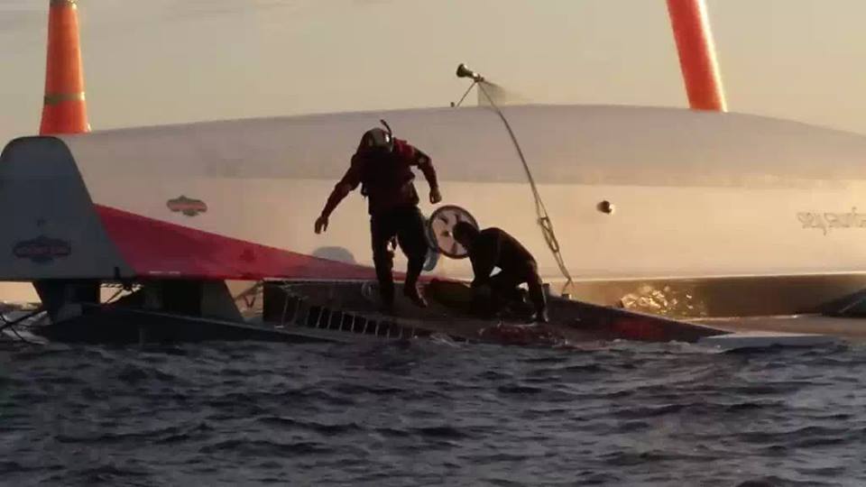 During the 5400 nm doublehaned Transat Jacques Vabre from France to Brazil, Lionel Lemonchois and Roland Jourdain capsized their 24-metre trimaran Prince de Bretagne just after 1900hrs UTC on October 26, one day after the race started in Le Havre.