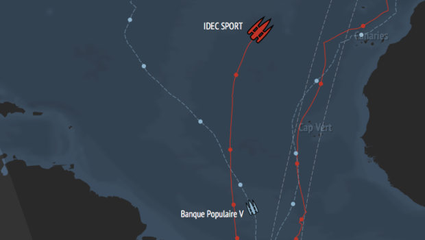 The maxi-trimaran IDEC SPORT stepped up the pace yesterday on the final stretch of her attempt to win the Jules Verne Trophy. It is looking windy and physical over the next 2000 miles or so to the finish off Ushant. Approaching the latitude of the Canaries, Francis Joyon and his men are making the most of the trade winds, which are swinging around astern of the boat allowing them to speed away downwind. Only the sea state and the swell are forcing them to calm things down.