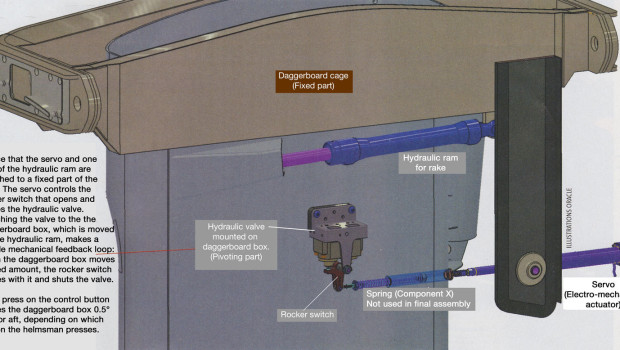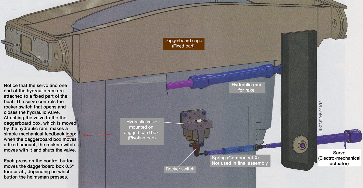 “OTUSA has released drawings and photos of their system, which used a simple ‘mechanical feedback’ loop to allow precise control of the daggerboard rake. Helmsman Jimmy Spithill had buttons on the wheel to rake the daggerboard fore and aft in precise increments of 0.5° giving him better control over lift for hydrofoiling.
