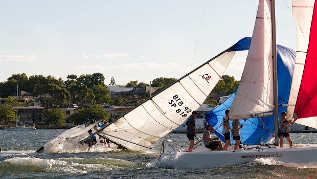 “Here’s a set of 10 images of a huge broach that happened just before the first race of the semi finals of the Schweppes Little Wheel match racing regatta at the South of Perth Yacht Club on the Canning River. The skipper was World Laser Radial champion and accomplished match racer, Tristan Brown.