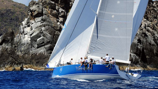 (April 2, 2014) – Racing at the 2014 BVI Spring Regatta and Sailing Festival got underway today with the Nanny Cay Cup Round Tortola Race. With light winds expected, the course was adjusted and the boats did not race around Tortola, but instead took a 14-mile, easterly course. It did not change the fleet’s agenda as Tonnerre de Breskens 3 won overall and Highland Fling XII took line honors.