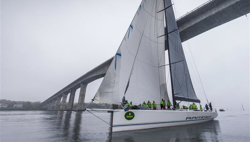 Newport, RI (June 13, 2014) – Sailors took to the low side of their boats in light air and rain during today’s Around the Island Race that kicked off the New York Yacht Club 160th Annual Regatta presented by Rolex. The 19-nautical-mile circumnavigation of Jamestown (Conanicut Island) was planned to be a brilliant teaser for this weekend’s two-day series off Newport, R.I., and so it was, from the perspective of hosting 105 magnificently cool boats (189 are due to race over the weekend). However, 4-5 knots of breeze pushed them along at the start before dissolving into nary a breath of wind on the backside of the island, forcing the race committee to shorten course halfway through and finish the fleet at the Jamestown Bridge in Narragansett Bay’s West Passage.