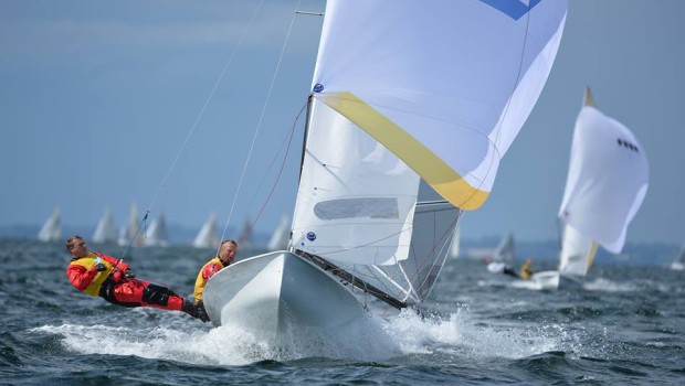 After a day of whacky races at the SAP 505 World Championship somehow Mike Holt and Rob Woelfel have managed to cling on to a slender 2-point lead in Kiel, Germany. In the first, medium-airs race it was the up and coming Aussies, Pete Nicholas and Luke Payne, who once again demonstrated an uncanny knack of sniffing out the tricky breeze and ploughed a lonely furrow out on the left-hand side of the track.