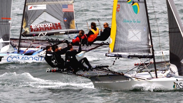 Tough even for the leaders. While McCormack was able to finish only one of the day’s three races, Australia’s ASCC skippered by Brett Van Munster suffered two of the fleet’s countless capsizes but moved into first place with a day’s finishing log of 1-3-2, four points ahead of America’s Howie Hamlin, who steered CST to a 4-1-1 performance.