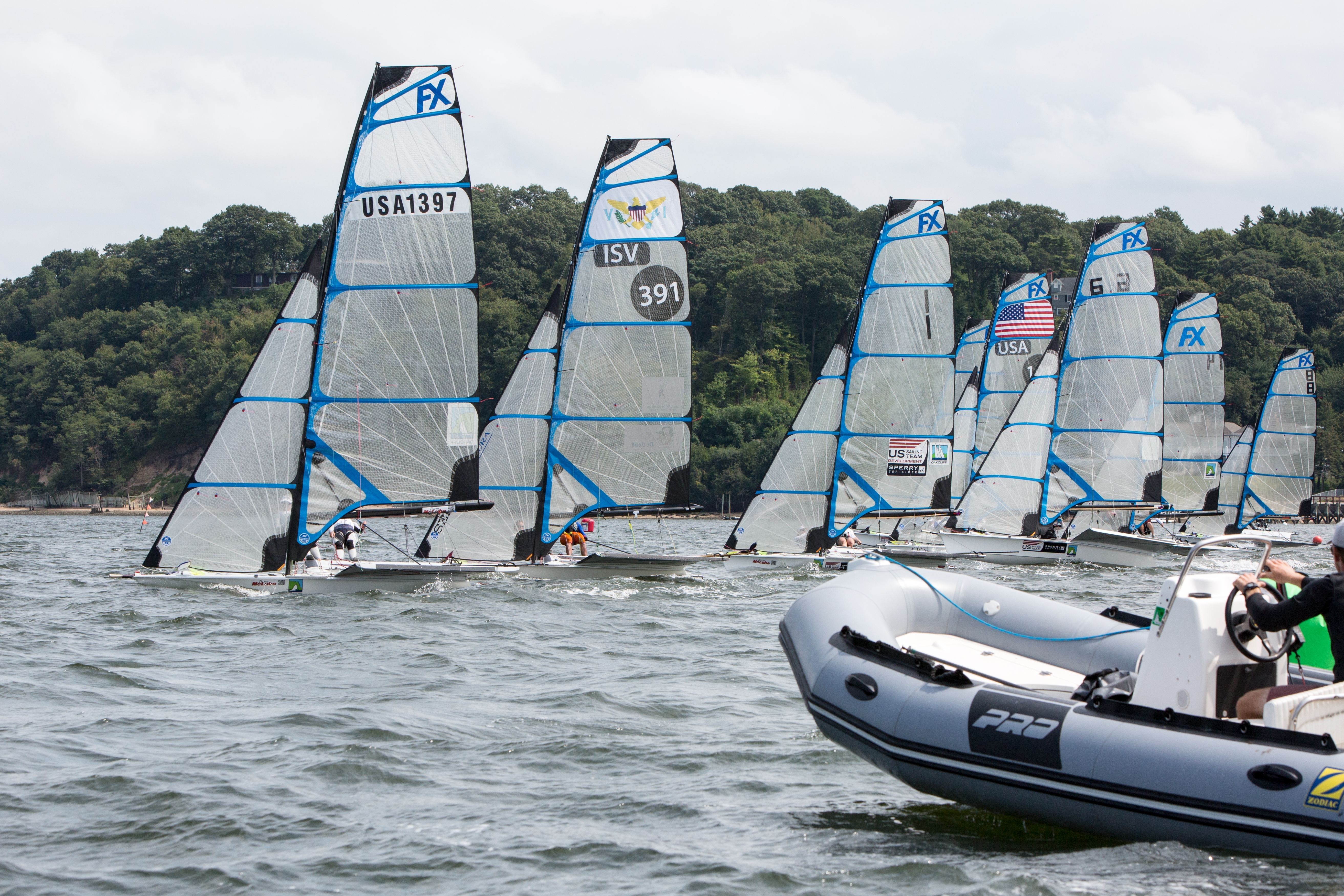 However, the 2014 49er, 49er FX, and NACRA 17 U.S. National Championship (August 22-24) hosted by Oakcliff Sailing experimented with a different approach: umpired fleet racing for the medal race. With no more than 10 boats in the medal race, the three umpire boats are able to canvas the course to make calls immediately once a protest flag is raised on the water during a race.