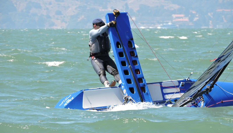 Earlier his competition, two time world champion (& 3 time runnerup) Steve Clark, capsized on the first weather leg. In case you didn’t know in the US the Clark family is synonymous with International Canoes. So surprise, surprise who pulls off the win: the relatively unheralded Mikey Radziejowski from Santa Cruz. How’d he get there? Practice, a good boat and great sails.