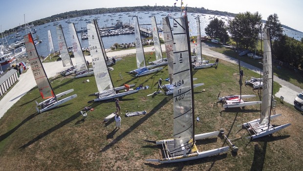 Bristol, RI (September 21, 2014) – As soon as the U.S. Multihull Championship began on Friday, it was clear that multi-time A-Cat North American Champion Lars Guck (Barrington, R.I.) was the most accomplished and experienced A-Cat sailor in the fleet of 15. On Sunday’s finale, Guck finished the regatta like he started on Friday, and won three more races to go undefeated through 11 races.