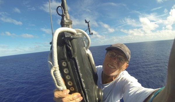 The Hungarian owner-driver climbed to the very top of the 29m-high mast, cutting free the halyard for Conrad to repair, while he fixed the halyard lead using an outer block.
