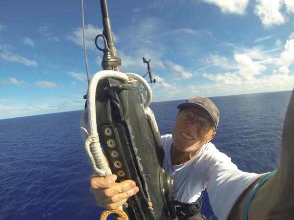 “I hoisted Nandor up the mast and he cut out the halyard after several attempts to dislodge it (I think I learned some new Hungarian words today!) and sent the shredded end down to me to repair. We now have an external main halyard with a pulley lashed in place at the mast head in the place of the damaged original.”