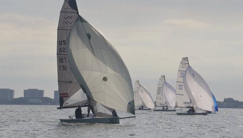 Sarasota, FL (January 30, 2015) – Three races were completed today for 28 teams competing in the VX One Midwinter Championship hosted by Sarasota Sailing Squadron in Florida. In winds ranging from 6-10 knots, John Potter and David Guggenheim have taken the early advantage after posting a 6,1,1 for 8 points. Justin Howard (13 points) and Donovan Brennan/Tim Pitts (16 points) laid claim to the top three.