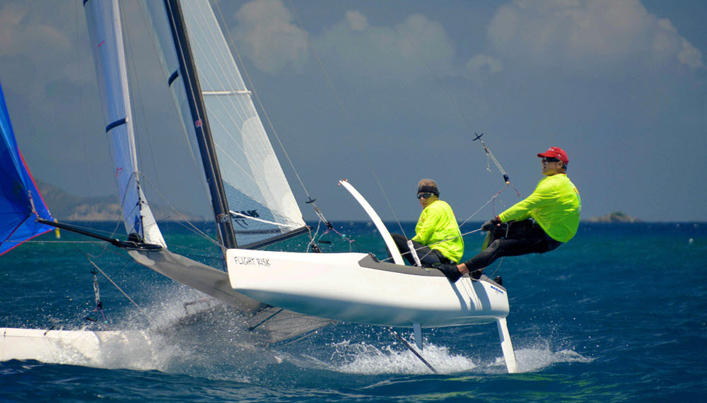 Gardner’s Flight Risk finished first in the Beach Cat class. Island Sol, a Hobie 16, and Whiplash, a Falcon F-16 owned by St. Thomas’ Paul Stoeken and Teri McKenna, respectively, ended second and third.