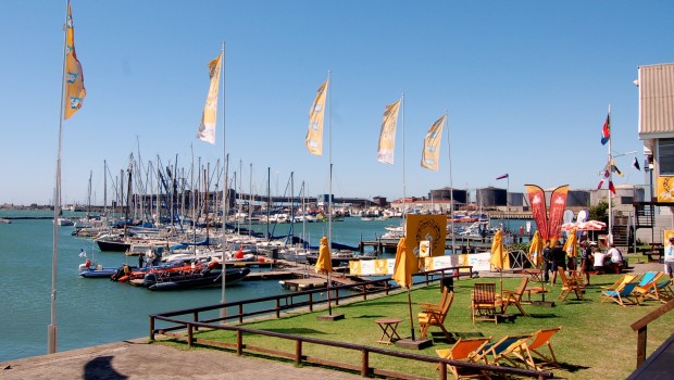 Port Elizabeth, South Africa (April 1, 2015) – After the layday yesterday, competitors at the 60th SAP 5O5 World Championship were greeted today with winds reaching 45 knots in Algoa Bay. The conditions in the Port of Port Elizabeth closed the port to any vessels wishing to leave or enter the harbour and the postponement flag went up for a two hour delay.