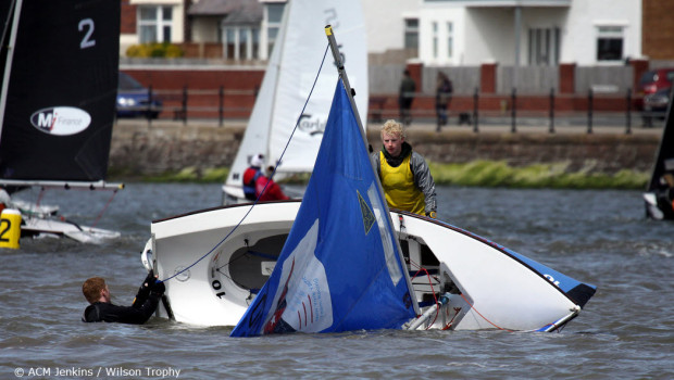 After nine hours of team racing with an hour long break, the 2015 Wilson Trophy has sailed 224 races. Going into the final day, the stand-out crews – much to the delight of the locals – are those of the reigning World Champions, West Kirby Hawks, currently on 13 wins from 15 races, two more than their nearest rivals.