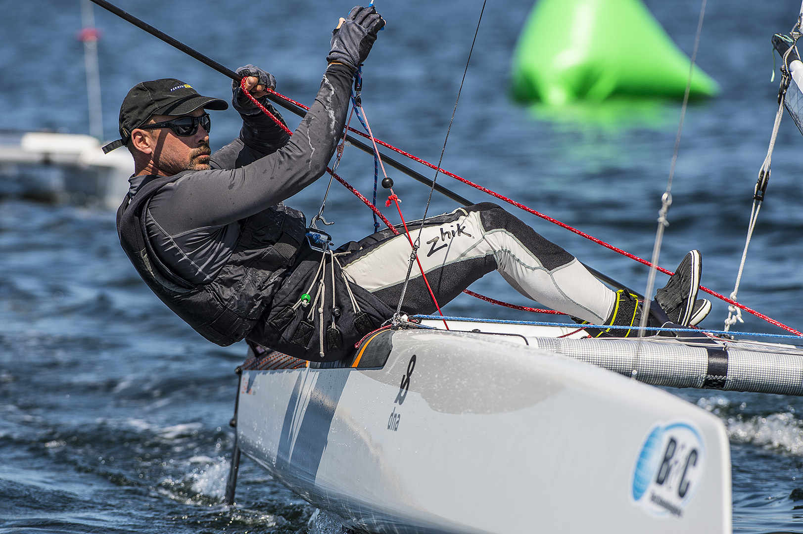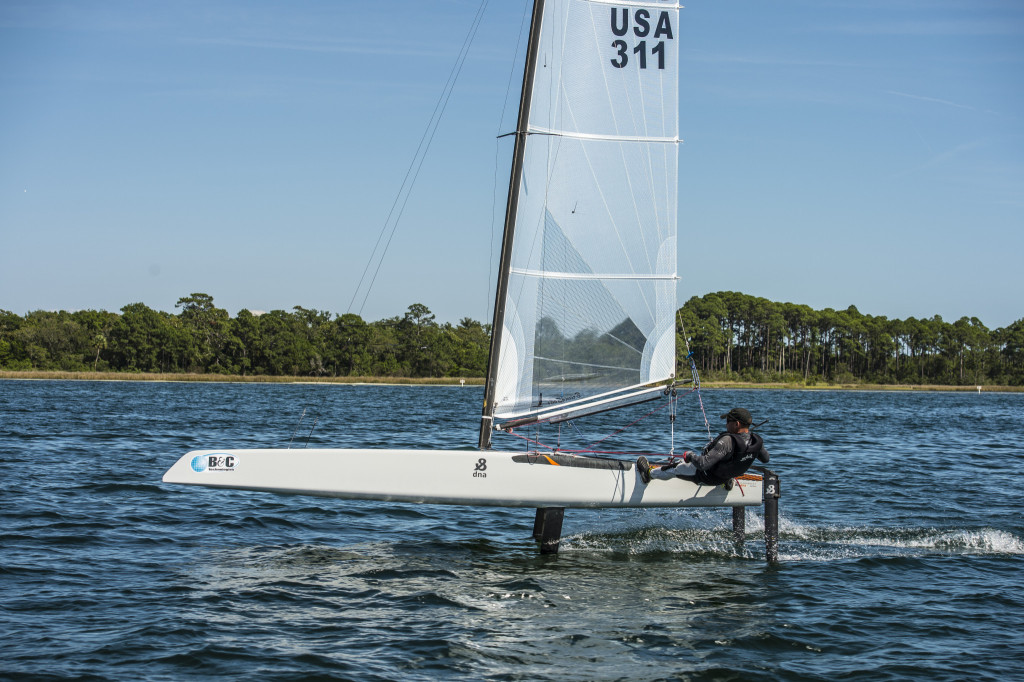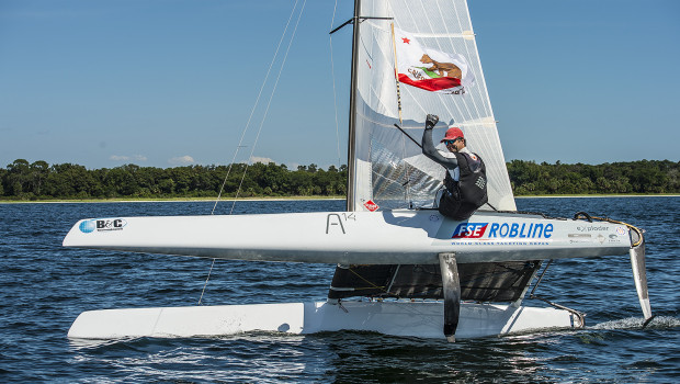 Bob Hodges, who suffered damage from a collision in day one and an over early penalty, battled back throughout the remaining three days to capture fifth place with the help of the second throwout. “I was really happy to get back into the top five. Overall this week I learned a lot downwind and felt like thing were starting to come together,” said Hodges, who races on the eXploder, a foiling design. “I think I’ve filled my notebook to take home and help me prepare for the Worlds in Italy.”