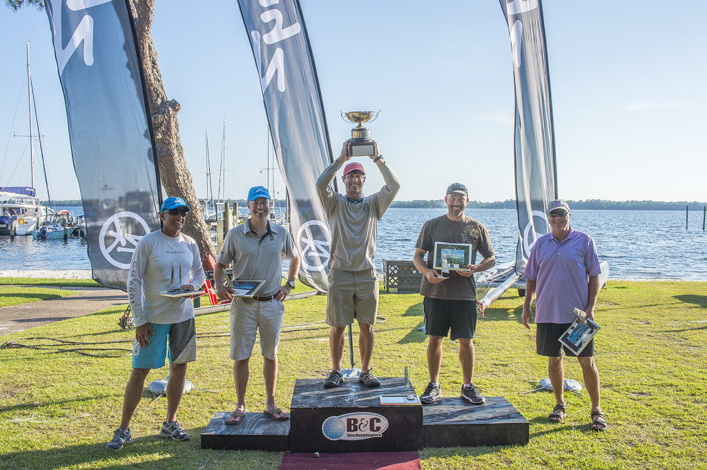 Panama City, FL (May 22, 2015) – St. Andrews Bay tested the 41 competitors’ light-air skills on the last day of the 2015 A-Class Catamaran North American Championship. Matt Struble secured his third North American championship title with two more first place finishes. Bruce Mahoney, last year’s champion, finished the event second overall with a 3-2 scorecard today. Bailey White captured third overall.