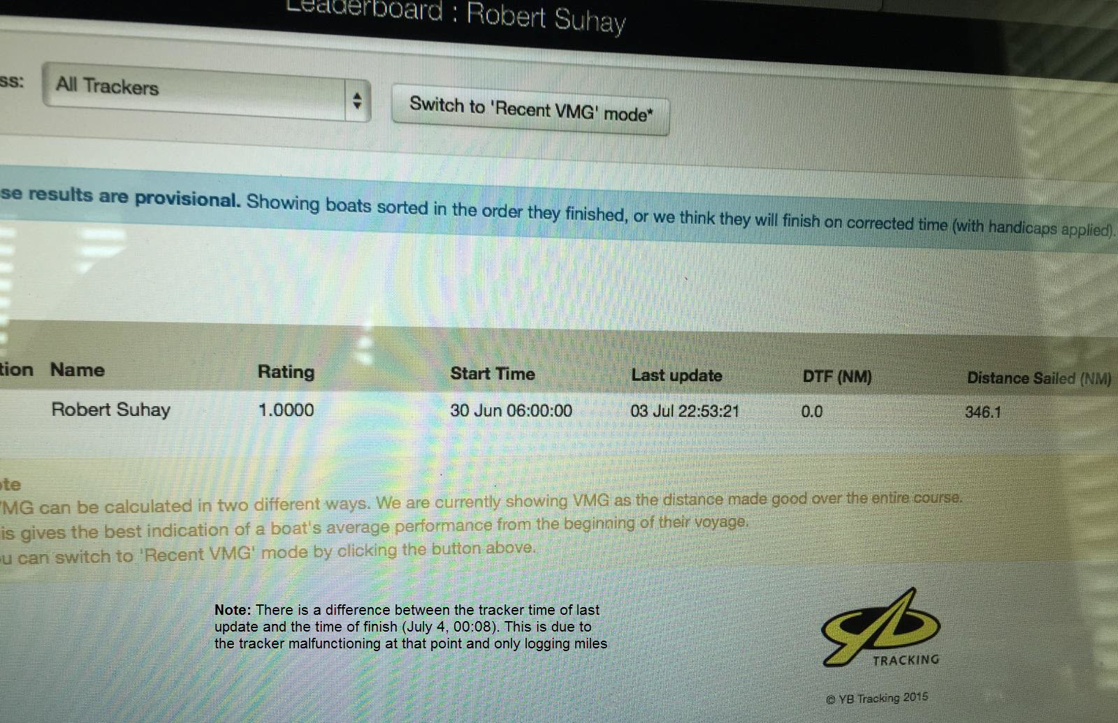 “He only took one sleep break on Thursday night (July 2) and drifted on to a sedge and briefly grounded when the tide went out,” reports his wife, Lisa Suhay. “However, he did not at any time make landfall or set foot on land. Satellite imagery of that event makes it look as if he’s on an island but when you play the GPS Track you can see the boat drifting in circles for a few hours as he slept. Boats up on the hard don’t drift in circles. But since we expect that to be something we will have to document with the help of Fish and Wildlife, we are currently placing the record breaking at the point just before he went to sleep at the sledge. That was 295.3 nm.”