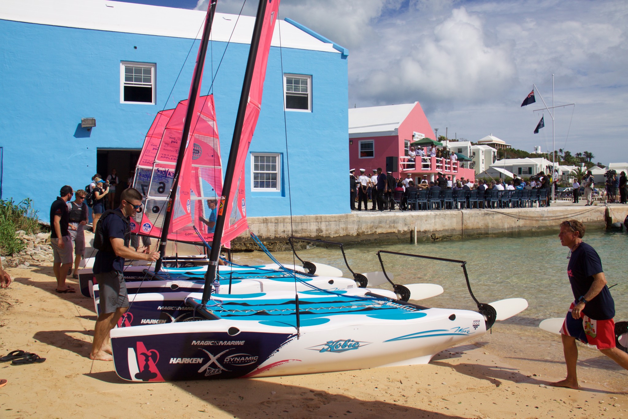 The Endeavour Program is aimed at youth who would not otherwise have the opportunity to sail. Events during the day included the official opening of the East Fort at the T.S. Admiral Somers Building as well as races on the RS Feva boats, Hobie’s, traditional Bermuda fitted dinghies, Open Bics and a rowing challenge as well. America’s Cup sailors from all six teams sailed with local youth sailors in many of these classes.