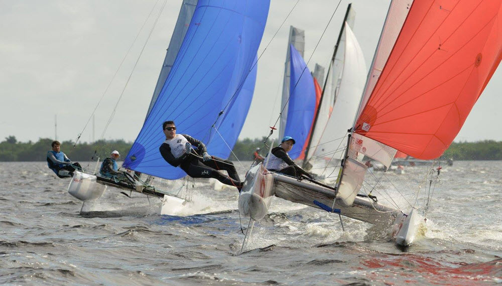 Sarah Newberry and Matthew Whitehead (USA) won the 2015 Zhik F18 Americas Championship, topping the field of 28 teams during the 15 race series held October 19-23 in Charlotte Harbor, FL. In addition to the Americas crown, Newberry and Whitehead won the 2015 U.S. F18 Nationals laurels and the 2015 Zhik F18 Americas Mixed-Crew title.