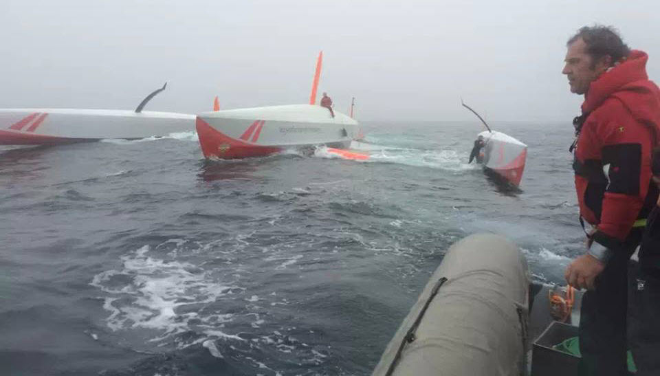 During the 5400 nm doublehaned Transat Jacques Vabre from France to Brazil, Lionel Lemonchois and Roland Jourdain capsized their 24-metre trimaran Prince de Bretagne just after 1900hrs UTC on October 26, one day after the race started in Le Havre.