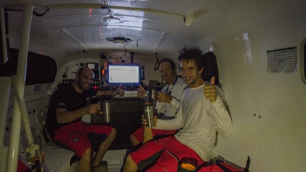 As for life on board, there are no worries either and the crew is doing well. “Of course, there was a little bit of tiredness as we made our way through the Doldrums, where the watch schedule fell to bits. I spent the night awake and the lads missed out on some of their rest periods too. But last night, we were able to recuperate. We charged up our batteries and we’re all in good shape and feeling good. We made a nice little video as we crossed the Equator (broadcast on Breakfast TV in France), where we raised out glasses to Neptune. I haven’t seen the finished version, but I raised my glass.”