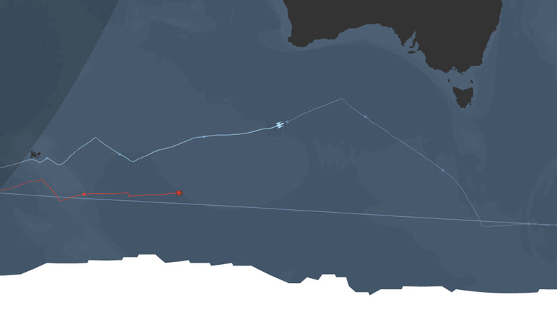After trailing the record pace by 800 nm on Sunday, IDEC SPORT is clocking up the miles at very high speed. Deep in the Southern Ocean, Francis Joyon and his crew of five have put their foot down, clearly stating their goal: to attempt to stay above 30 knots for as long as possible and weave their way around the Great Circle Route low down in the Furious Fifties between 52 and 54 degrees south.