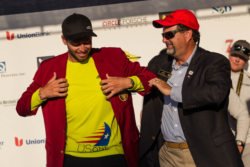 Canfield was greeted at the Long Beach Yacht Club by his dad, Bill Canfield, and girlfriend Stephanie Roble, 2014 Rolex Yachtswoman of the Year. Wearing a USVI flag like a cape, he looked a bit like a super hero: a super hero drenched in champagne.