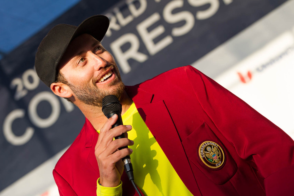 Carried to the poolside stage by his crew, to don his third Crimson Blazer and hoist the Congressional Cup trophy, he commended his crew. “We lost four races all week … to be at this level, racing against the top teams in the world: that’s the world champion team I have behind me.”