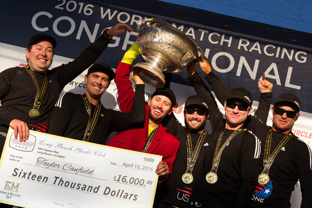 Long Beach, CA (April 10, 2016) – Taylor Canfield and his USOne Sailing Team triumphed in the Congressional Cup regatta, Stage Two of the World Match Racing Tour (WMRT), after five days of “unbelievable match racing” – making him the first skipper to win three Crimson Blazers back-to-back, in the 52-year history of the legendary regatta.
