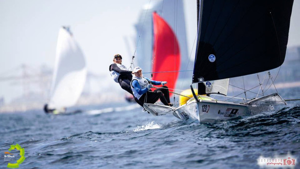 Barcelona, Spain (April 12, 2016) – On the second day of the 49er and 49erFX European Championship, the 49erFX took to the waters first with a much lighter start than day 1, with the teams crouching on the wing for the first two races before the wind filled in to ten knots for the third race.