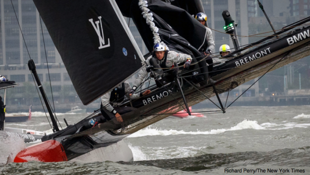 Peter Burling spent the weekend driving a high-performance catamaran at 30 miles per hour toward a concrete wall lined with thousands of spectators. He had to take into account a three- to five-knot current that ran along the Hudson River as he picked precise trajectories past competitors and floating marks while judging distances and counting the seconds to each maneuver.