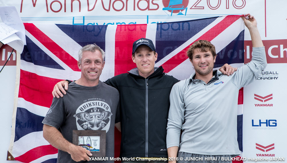 Hayama, Japan (May 29, 2016) – The final day of the YANMAR Moth Worlds 2016 could only complete one race, with leader Paul Goodison (GBR) posting a second to secure his first Moth World title. Thirty-eight year old Goodison, 2008 Beijing Olympic gold medalist in the Laser Class, won the British battle with Chris Rashley finishing second and Robert Greenhalgh, who won the final race, who ended in third.
