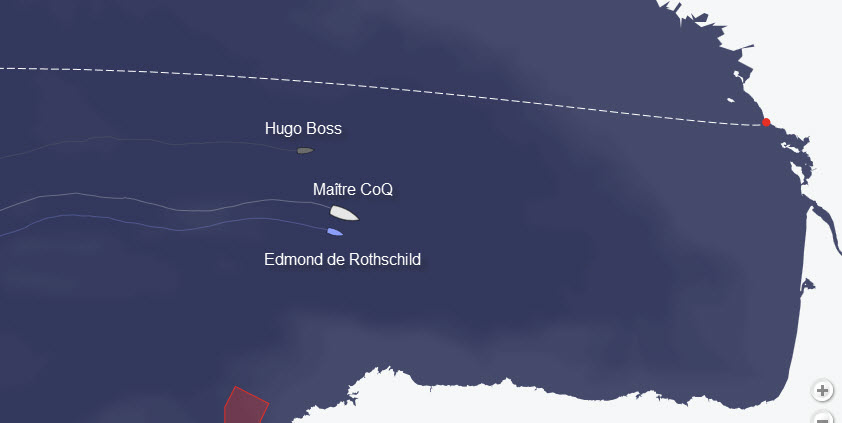 The leading IMOCA 60 trio of Beyou, Sébastien Josse (Edmond de Rothschild) and Alex Thomson (Hugo Boss) were still sailing in a southwesterly breeze just behind a cold front today, which allowed them to average around 12 knots still. But it is going soft in front of them and their apparently unavoidable destiny is to spend tonight in the bubble of high pressure that is forming over the Bay of Biscay.