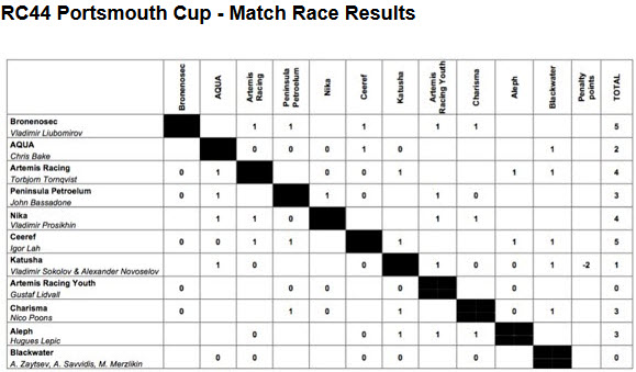 Portsmouth, UK (July 13, 2016) – Vladimir Liubomirov’s Bronenosec Sailing Team was the class act on the opening day of match racing at the RC44 Portsmouth Cup, notching up a perfect scoreline, winning all five of its matches.