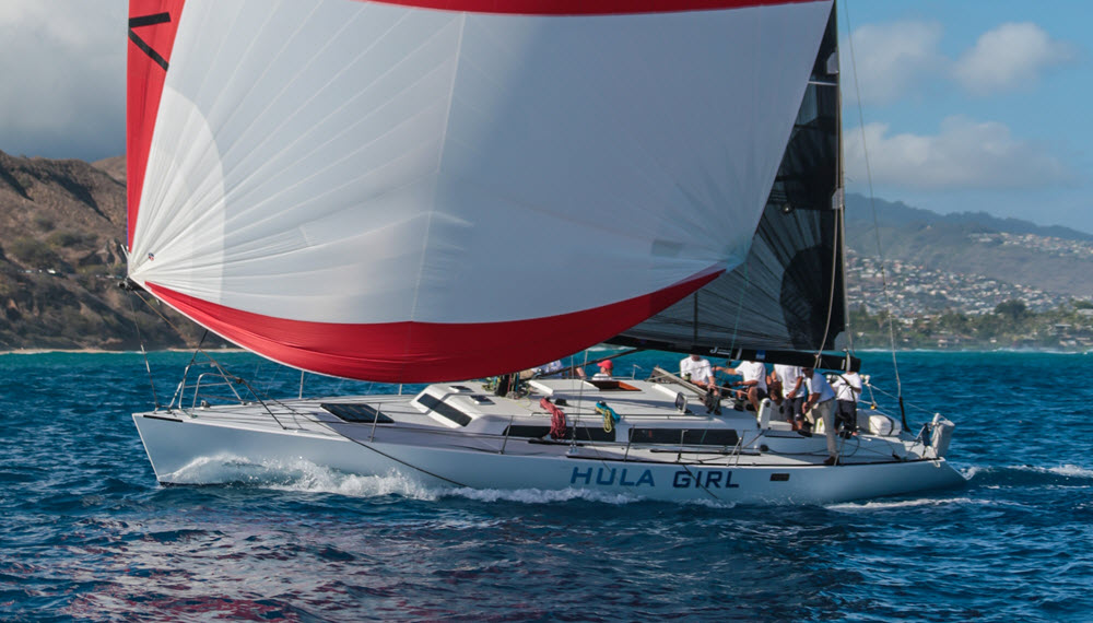 The good stuff happens when you cross ridge and into the SE corner of the semi-permanent Pacific High pressure system which lives in the northern Pacific. This shift the breeze (and the swells) around behind the boat, and, well, away we go. It’s what makes this race so famous and popular. Well, I’m happy to say that this morning, just after roll call, we shook the reef and set our 4A spinnaker (heavy runner) in some 26 knots of breeze. We are instantly surfing in the 15 knot range and it is trial by fire for the fresh crew aboard Hula Girl!