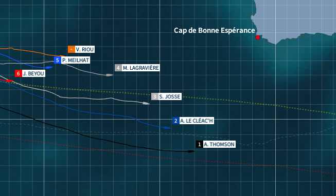 That is where the British skipper is heading with Armel Le Cléac’h (Banque Populaire VIII) and Sébastien Josse (Edmond de Rothschild) a hundred miles or so north with winds forcing them to continue eastwards. The gap from north to south is set to increase with the advantage going to Thomson, who will be sailing along the Ice Wall at 42°30S: more wind and a better bearing should see him extend his lead.