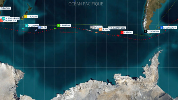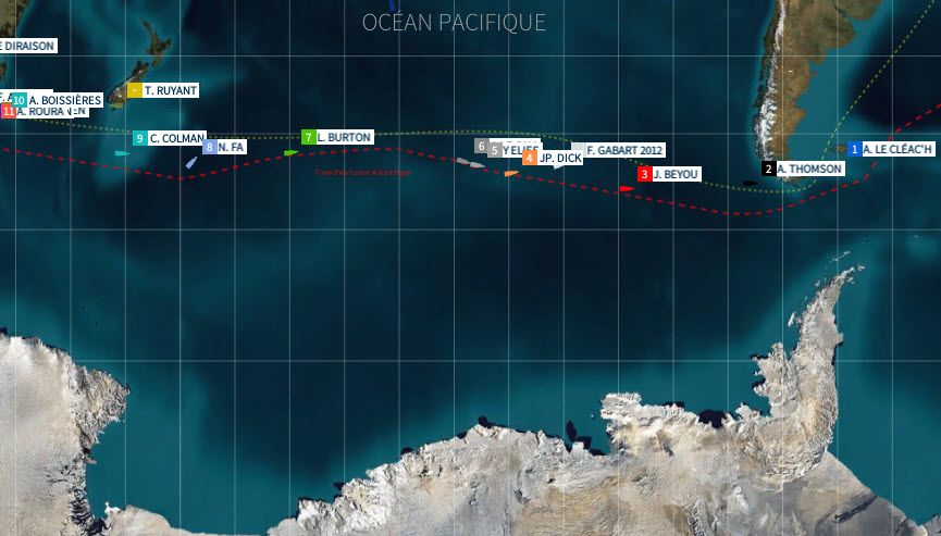 Four sailors are expected to round the Horn by next Friday. 1600 miles behind Armel Le Cléac’h, Jérémie Beyou (3rd on Maître CoQ) is sailing in a nortehrly wind, which is pushing him along at almost twenty knots. Jérémie should continue to take advantage of fine conditions in the days ahead. There will be a gybe to do on Sunday evening or Sunday night and he is expected to pass Cape Horn at midday on Tuesday. Still in fourth place Jean-Pierre Dick (StMichelVirbac) can see Yann Eliès (Quéguiner Leucémie Espoir) and Jean Le Cam (Finistère Mer Vent) catching him. All three were becalmed in a wind hole last night. Jean-Pierre should be the first to pick up some more wind, while Yann and Jean will have to wait until this evening to get going again. The gap is therefore likely to open up again. Dick is expected to reach Cape Horn on Thursday with Eliès and Le Cam there the following day…