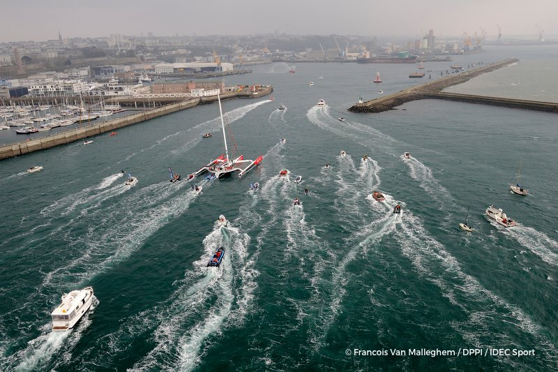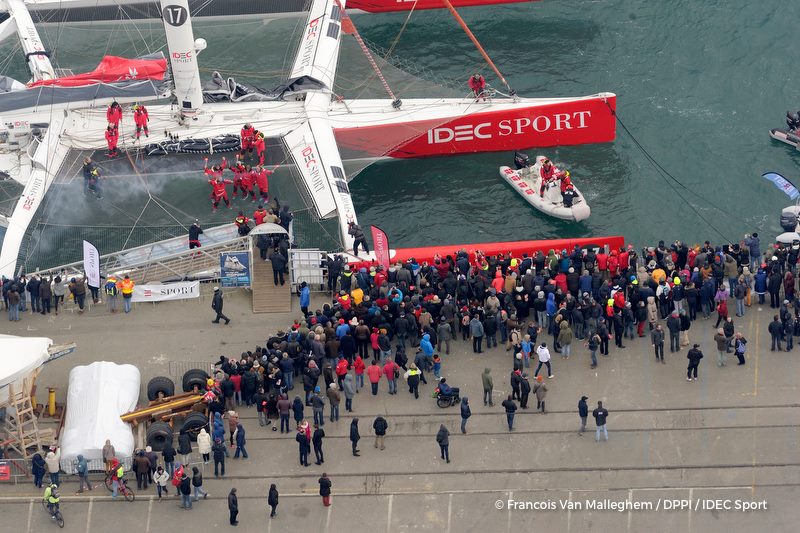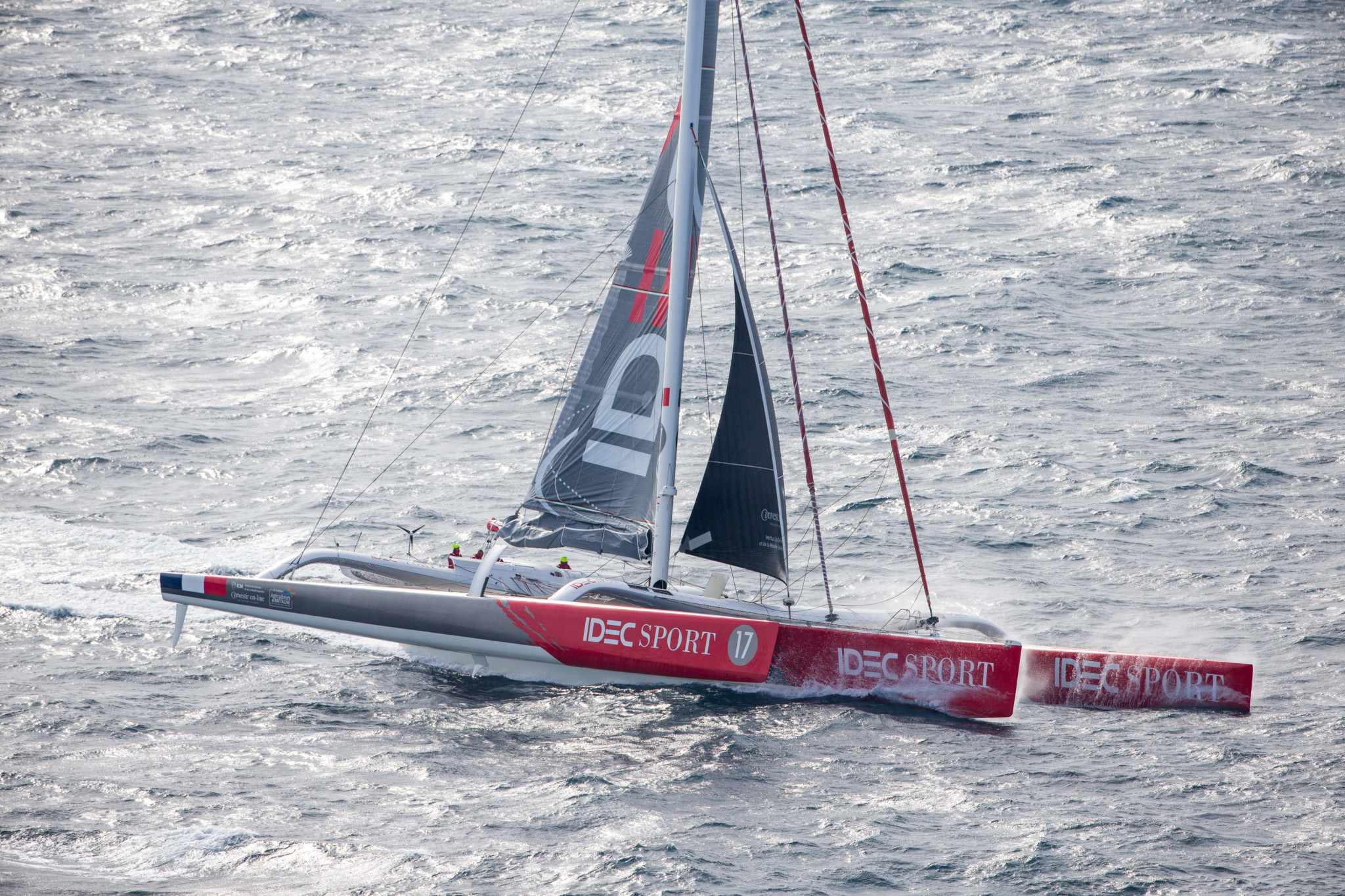 (January 26, 2017) – The 31.5 trimaran IDEC SPORT sailed by Francis Joyon (FRA), Clément Surtel (FRA), Alex Pella (ESP), Bernard Stamm (SUI), Gwénolé Gahinet (FRA), and Sébastien Audigane (FRA) today won the Jules Verne Trophy, awarded for the fastest circumnavigation of the world by any type of yacht with no restrictions on the size of the crew, starting and finishing between the Le Créac’h Lighthouse off the tip of Brittany and the Lizard Point in Cornwall.
