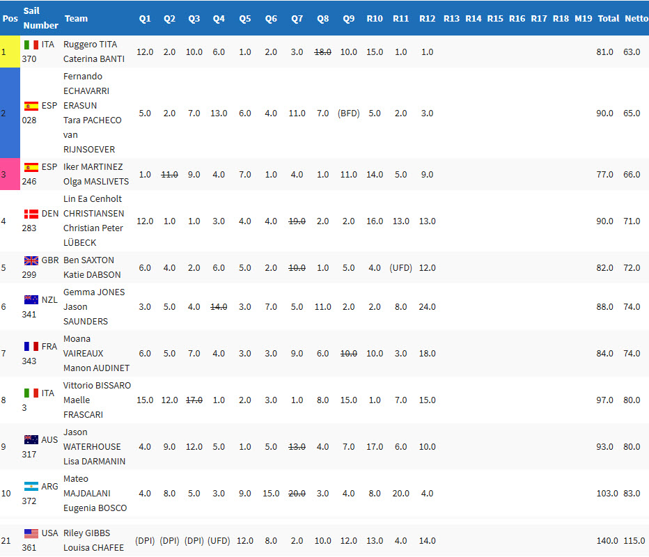 As recently crowned European Champions Ruggero Tita and Caterina Banti (ITA) stepped two points clear at the top of the leaderboard, Italian teams won all three races. Tita and Banti finish the day two points ahead of Spanish rival pairs Fernando Echavarri and Tara Pacheco and Iker Martinez and Olga Maslivets who are just one point apart.