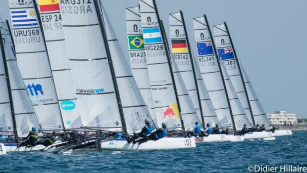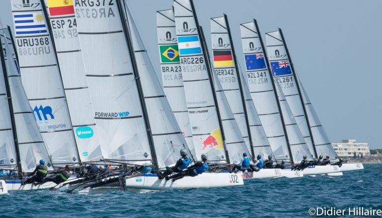 La Grande Motte, France (September 8, 2017) – The first day of gold fleet racing at the Nacra 17 World Championships saw top teams stumble, leading to a new order at the top of the standings.