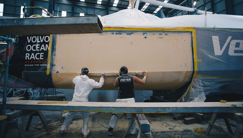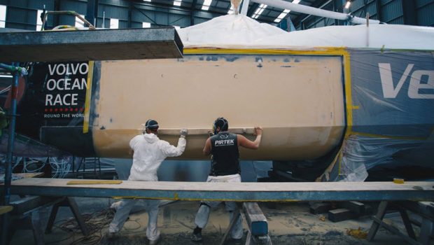 The team’s VO65 was shipped to New Zealand from Hong Kong on January 28. A new port bow section was laid up over a VO65 hull mold at Persico Marine in Italy and then sent to New Zealand, where it was spliced to the hull of the team’s VO65 in the past two weeks.