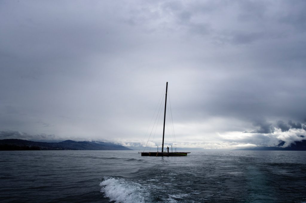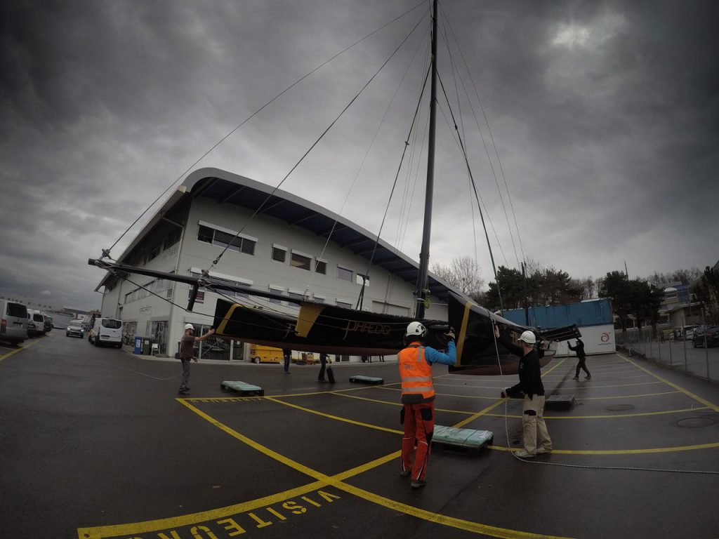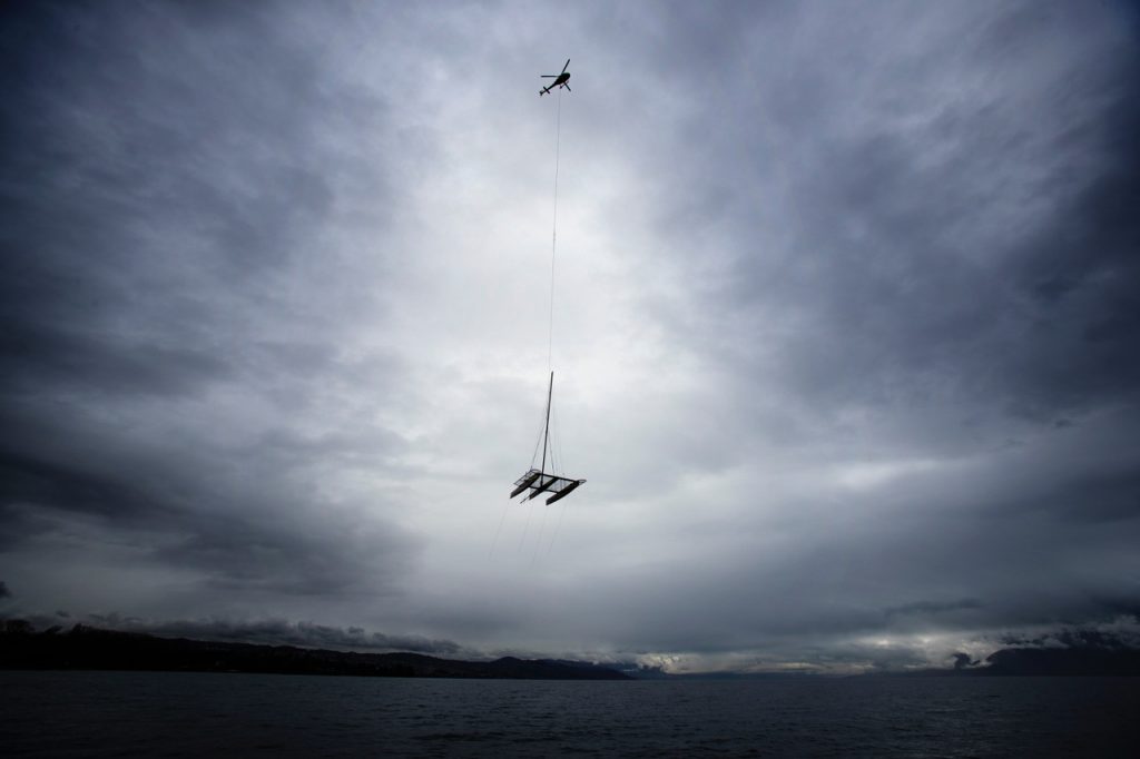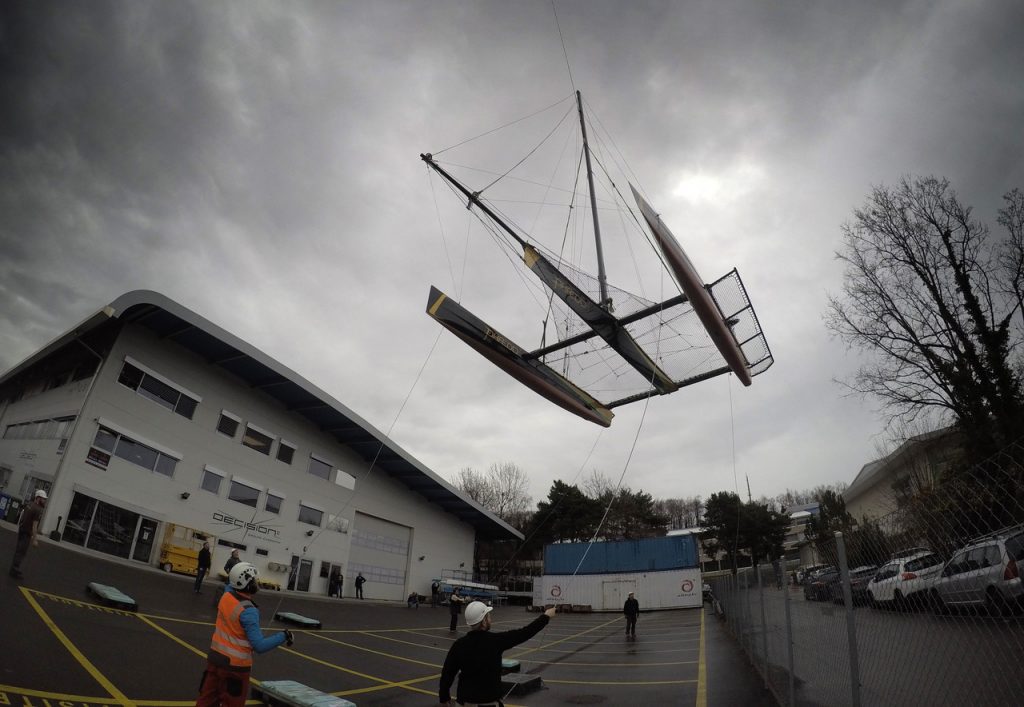 Moving the Decision 35 (D35) multihull from the Decision boatyard in Switzerland to Lake Geneva is done by helicopter. Here are photos and video following the transit of Lloyd Thornburg’s Phaedo^2 and Ernesto Bertarelli’s Alinghi.