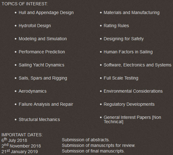The 23rd Chesapeake Sailing Yacht Symposium will take place March 2019 in Annapolis, Maryland. The organizing committee is inviting the submittal of papers on topics relating to the design, construction, and operation of all types of sailing yachts. Submit abstracts and questions to: CSYSpapers@gmail.com