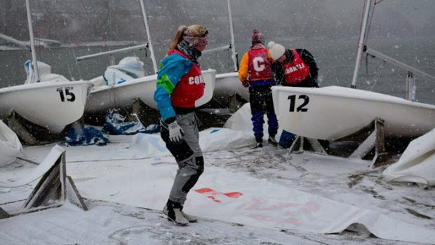 “It was by far the coldest regatta in memory,” said Hobart and William Smith head coach Scott Iklé. “We put windshield de-icer on the sheets and controls to keep the lines functional. It was miserable with wind chill below 20 degrees and big snow squalls would rolling through causing the race to disappear as we watched from land.”
