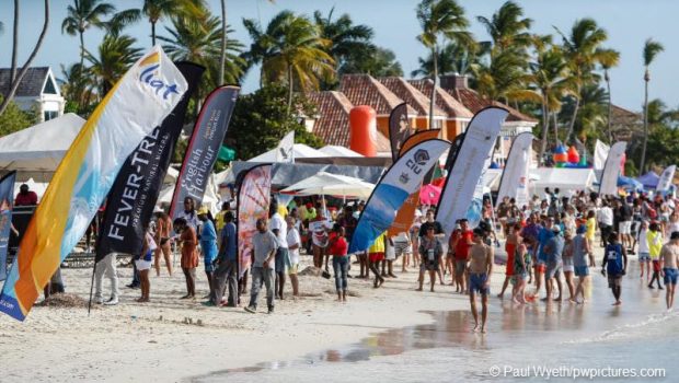 Competitors gather after racing for the daily prize giving. On May 1, internationally acclaimed reggae artiste, Tarrus Riley is set to headline at Reggae in the Park along with DJ Puffy and Private Ryan, one of the most highly anticipated events on the Antigua Sailing Week Party Calendar. After the big party night, the Wadadli Lay Day Beach Party on May 2 will this year include fun dinghy and SUP racing and zany beach games along with a line-up of seven DJs.