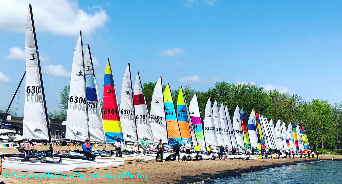 To celebrate the 50th anniversary Hobie 14 North American Championships, 33 competitors gathered for 11 races on May 16-18 in Brewerton NY. Jim Sajdak and Matt Bounds finished tied on points, with Sajdak getting the title on countback. Details.