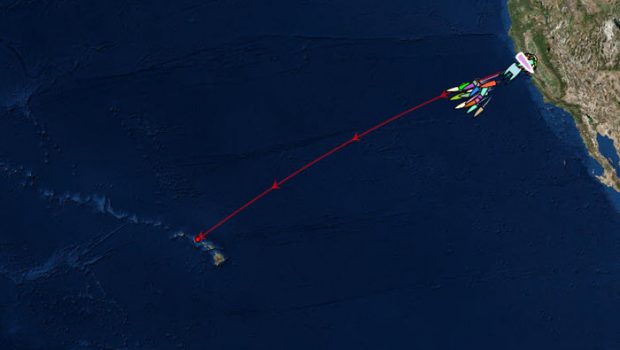 San Francisco, CA (July 11, 2018) – The second wave of starters got underway today for the 20th edition of the Pacific Cup to Hawaii. Two divisions of PHRF join the 2,070 nm race from San Francisco to Kaneohe Bay, Oahu. Two more dates on July 12 and 13 will complete the starting procedure.