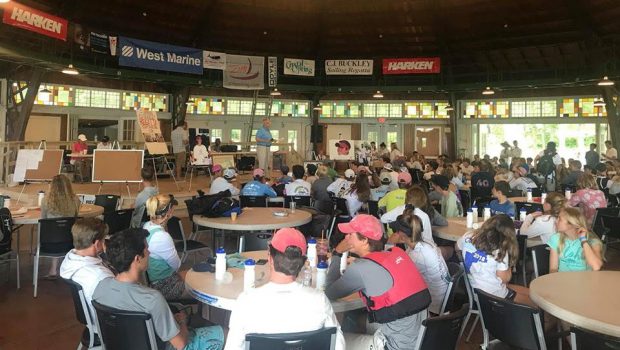PRO Justin Assad led the group through the nuts and bolts of the day at the competitors meeting, and briefly held them ashore on day one due to a shortage of wind. Sailors didn’t get much of a break, and by 11:30am racing started on the outskirts of Greenwich Bay.