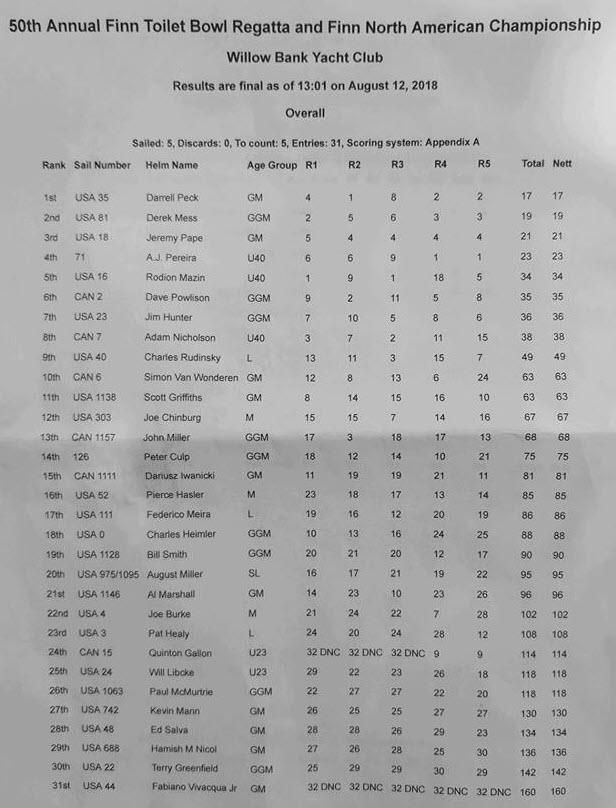 The 2018 Finn North Americans and 50th Annual Toilet Bowl Regatta held August 10-12 on Cazenovia Lake in Cazenovia, NY.