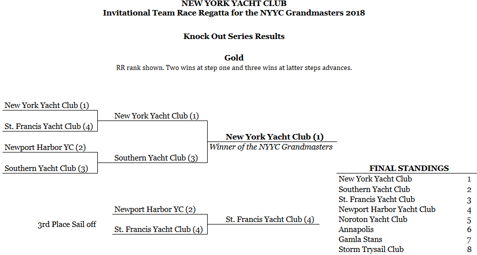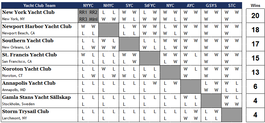 After three full round robins and then a mini round robin with the top five teams, New York Yacht Club was two points ahead of Newport Harbor, with Southern Yacht Club in third and St. Francis Yacht Club in fourth.